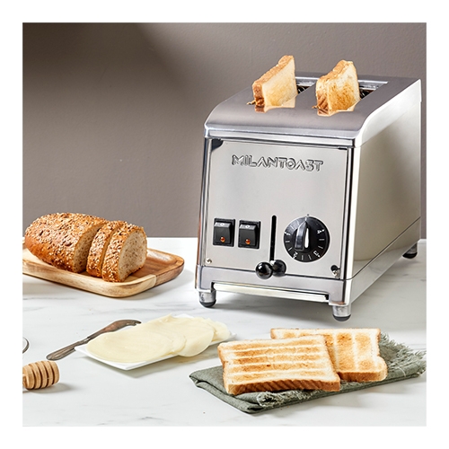 de broodrooster in gepolijst roestvrij staal is compact en direct opgewarmd en klaar voor gebruik. Met een energiebesparende selectieknop om één of beide sleuven te verwarmen en voorzien van duurzame verwarmingselementen voor gelijkmatige bruining en een zelfreinigend systeem.