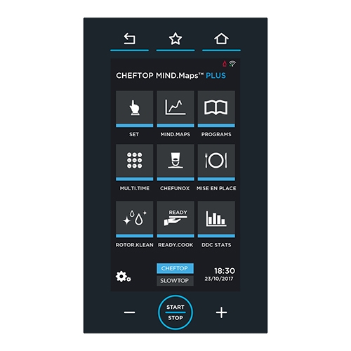 de UNOX Mind.Maps PLUS onderscheidt zich door het fraaie design en het bedieningsgemak van het 9,5 inch capacitieve bedieningsdisplay, hiermee kunnen gerechten handmatig bereid worden of gebruik de revolutionaire Mind.Maps technologie, maar het geeft ook toegang tot een lijst met bereidingscycli die eerder zijn opgeslagen of er kunnen nieuwe recepten gemaakt en opgeslagen worden. De oven beschikt o.a. over Adaptive.Cooking voor altijd een perfect resultaat, Multi.Time dat u in staat stelt om verschillende producten tegelijk te bakken met behulp van 10 timers en Mise.en.Place waardoor alle gerechten op dezelfde tijd klaar zijn, met CHEFUNOX heeft u beschikking over een voorgeprogrammeerde bibliotheek met programma’s voor een maximaal kookresultaat. De Dry.Maxi technologie draagt zorg voor afvoer van vocht uit de oven, Steam.Maxi voor perfect stomen, Air.Maxi voor een perfecte heteluchtcirculatie en het automatische reinigingssysteem Rotor.Klean draagt zorg voor een schone ovenruimte. Met behulp van de geïntegreerde WIFI-module bestaat de mogelijkheid om o.a. uw receptenboek op afstand te beheren, te synchroniseren en het verbruik van uw oven te monitoren.
