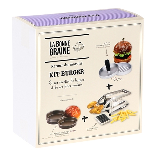 Ideaal voor het hele gezin en beginners, deze complete set maakt de bereiding van heerlijkste hamburgers mogelijk. Samenstelling van het hamburger – 1x fritessnijder – 1x hamburgerpers – 4x broodvormen – Recept ideeën