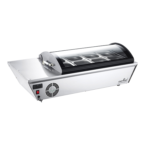 de opzet koelvitrine is uitgerust met deksel van veiligheidsglas, is digitaal thermostatisch regelbaar +2°C / +12°C en is voorzien van verlichte hoofdschakelaar, wordt compleet geleverd met 8 bakjes van 100mm diep en strippen