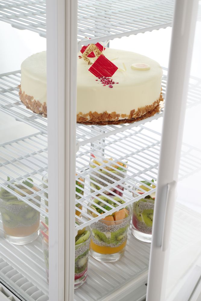 Geschikt voor allerhande gekoelde producten. Voorzien van dubbelglas en verstelbare schappen.