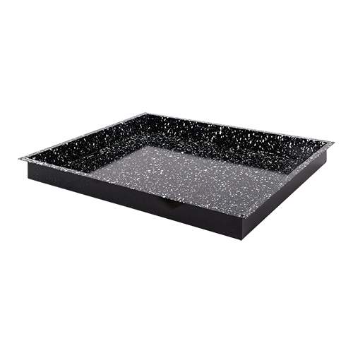 om het reinigen van de ovenschaal te vergemakkelijken, zijn speciale witte spikkels met een diameter tussen 1 en 4 mm op het oppervlak aangebracht. Door dit speciale procédé blijft het vuil discontinu plakken, waardoor het schoonmaken een stuk eenvoudiger wordt