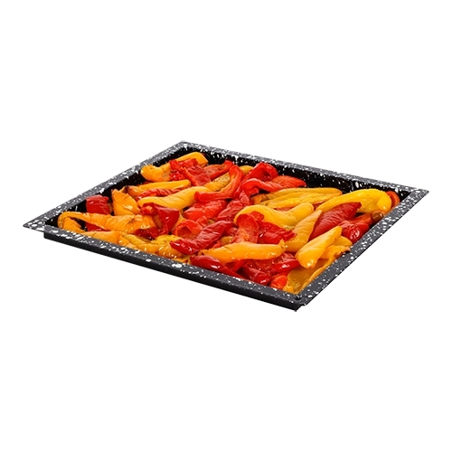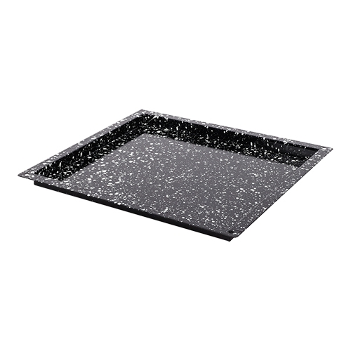 om het reinigen van de ovenschaal te vergemakkelijken, zijn speciale witte spikkels met een diameter tussen 1 en 4 mm op het oppervlak aangebracht. Door dit speciale procédé blijft het vuil discontinu plakken, waardoor het schoonmaken een stuk eenvoudiger wordt