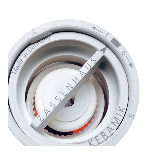 stel eenvoudig de maalgraad in van het keramische precisie maalwerk van extra fijn tot extra grof, in zes niveaus weergegeven op de molenvoet. De maalwerken in de Zassenhaus molens van beukenhout kenmerken zich door hun lange levensduur